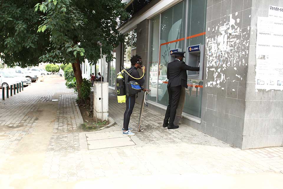 In the video Apneia (2012), Hyrcan rides a skateboard through Luanda while wearing a diver’s suit and a breathing apparatus. The route follows the promenade alongside the bay and through adjoining districts where old and newly renovated colonial buildings alternate with highrise buildings to define the view of the streets. He is followed by an attendant wearing a chauffeur’s uniform and likewise riding a skateboard.