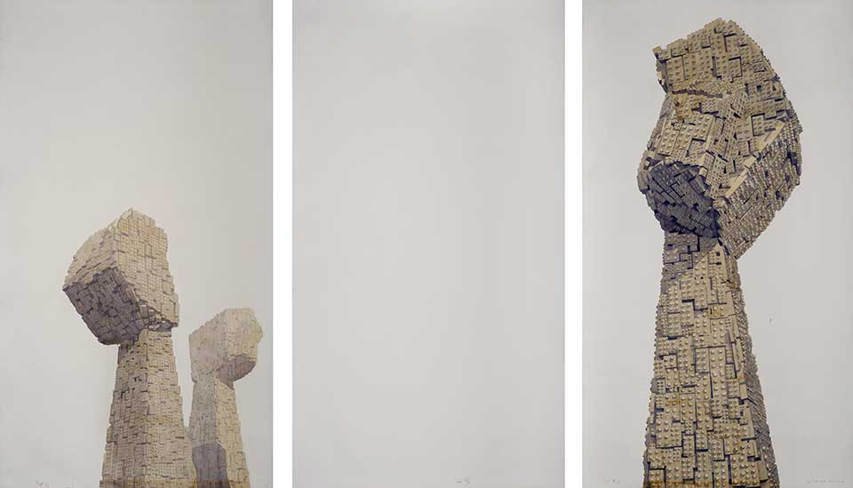 Los Carpinteros, namentlich die aus Kuba stammenden, im Duett arbeitenden Marco Antonio Castillo Valdes und Dagoberto Rodríguez Sánchez, haben dieses Denkmal in einem großformatigen, aquarellierten Triptychon zu einer Art modularen, aus Lego-Steinen zusammengesetzten Architektur transformiert. Die auf eine lange Verweildauer angelegte Materialität des Betons ist überführt in einen Zustand eines temporären Gefüges, als könnten je nach Bedarf oder ideologischer Anforderung aus diesen Steinen neue Erinnerungsstätten kreiert werden. Das mittlere Bildfeld, im Triptychon üblicherweise reserviert für die Kernerzählung, ist leer gestellt und deutet die Brüchigkeit der Rezeption solcher Denkmäler in heutiger, politisch liberalerer Zeit an. Los Carpinteros‘ Skulpturen und Interventionen im öffentlichen Raum gelten als Ikonen von souveräner, suggestiver und bisweilen erzählerisch heiterer Kraft.